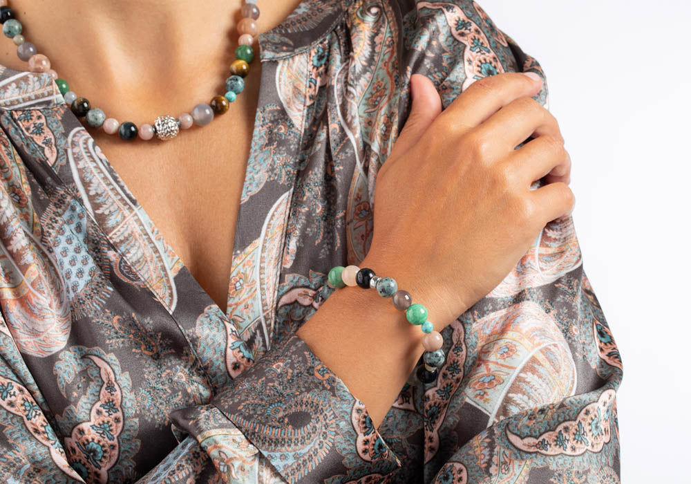 Sonnenstein, Grauer Achat, Tigerauge, Howlith, Jaspis, Labradorit, Schwammquarz Armband