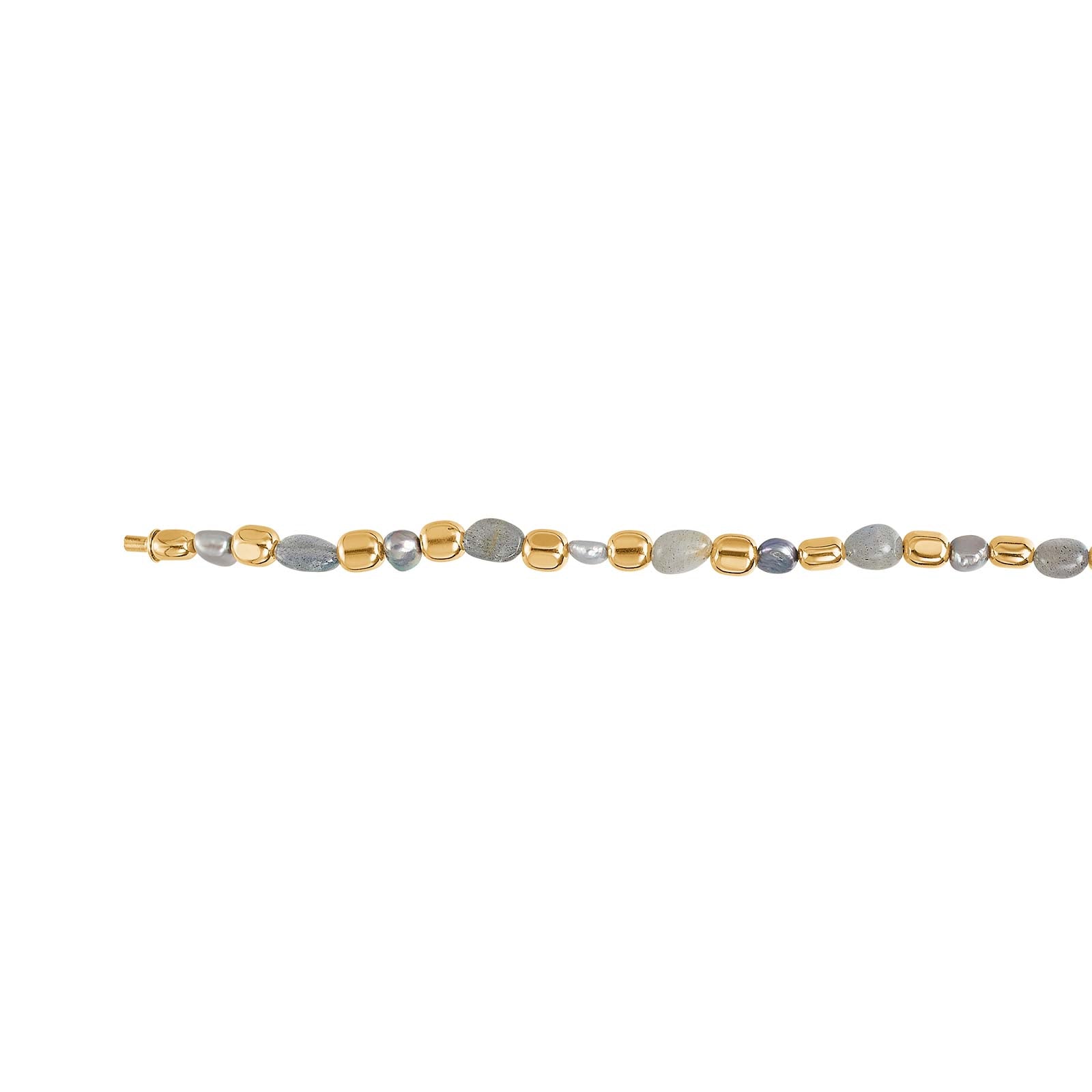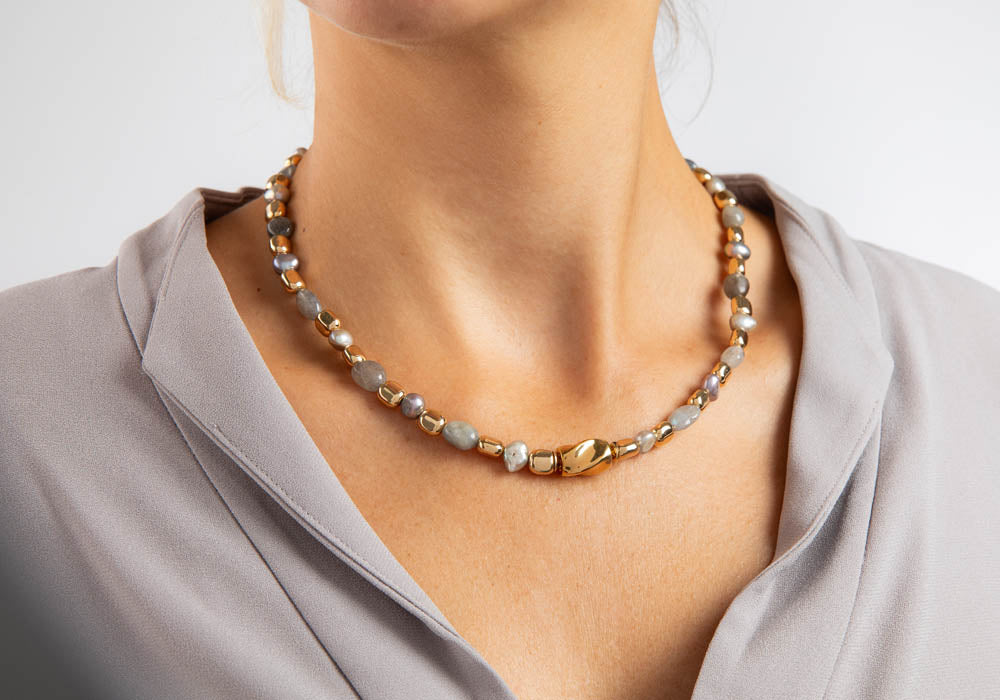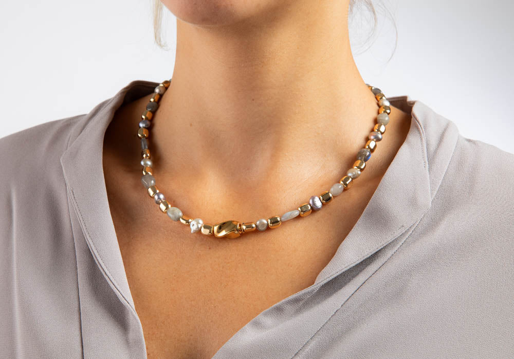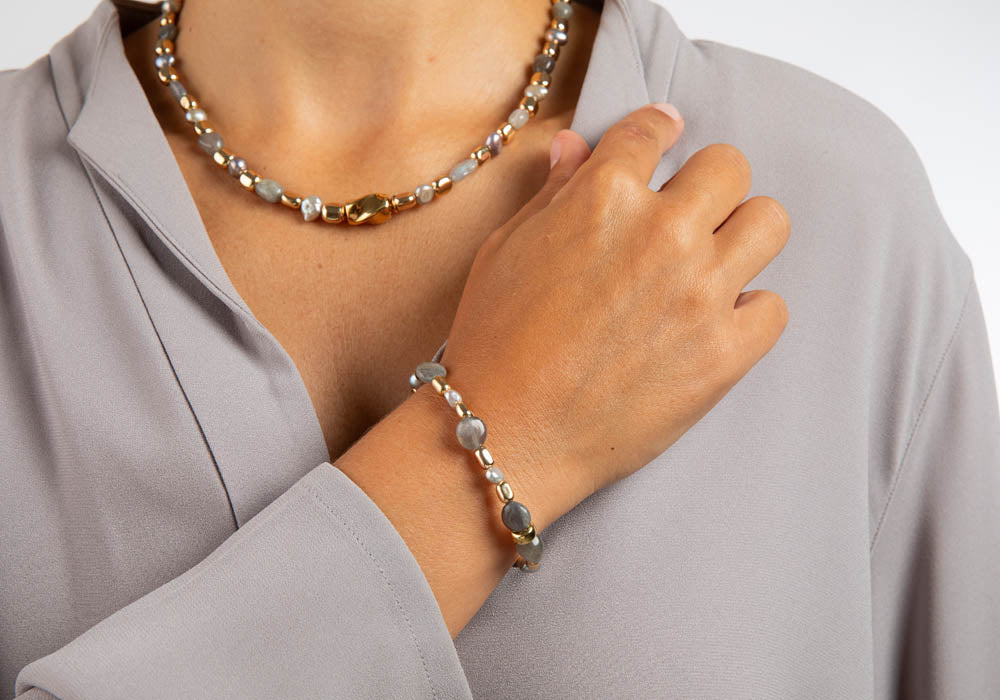 Elegante Steinkette mit Hämatit und Labradorit. Eine edle Kombination aus grauen Steinen und vergoldeten Elementen im attraktiven Wechselspiel. Mit dazugehörigem Armband verfügbar.