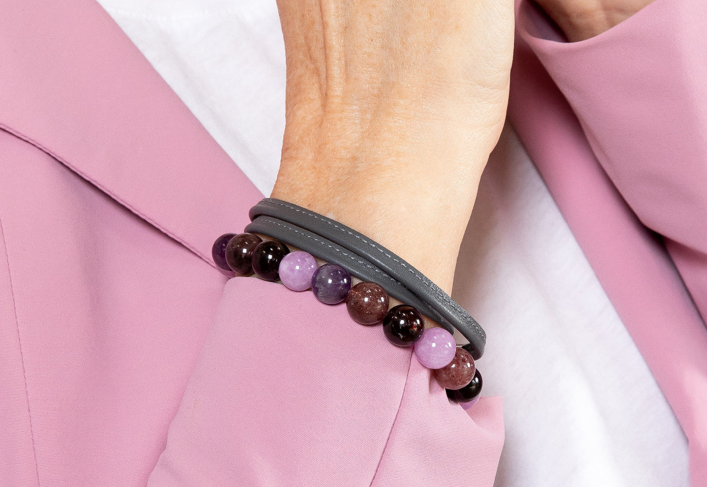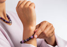 Farbenfrohes und ausdrucksstarkes Armband aus wunderschönen violetten und rötlichen Steinkugeln. Das Armband besteht aus Amethyst, Kirschquarz, Schwammquarz und Granat sowie aus einem Zwischenelement aus Sterlingsilber. Die Länge des Armbands beträgt 19 cm und der Durchmesser der Steinkugeln beträgt 12 mm.