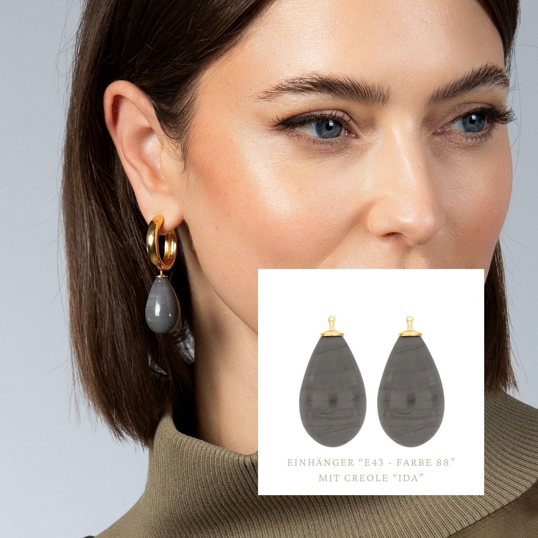 Wunderschöne Maxi-Einhänger "E43" in Tropfenform von Heide Heinzendorff. Jeder Glastropfen wird im Feuer hergestellt und von Hand gezogen und gedreht. Ein unverwechselbares Original, welches sich optimal mit den System-Creolen kombinieren lässt. Minimale Größen- und Farbabweichungen sind somit leider unvermeidbar. Aber das macht diese Schmuckstücke erst so liebenswert. Die Einhänger "E43" haben die Maße 24 x 12 mm.